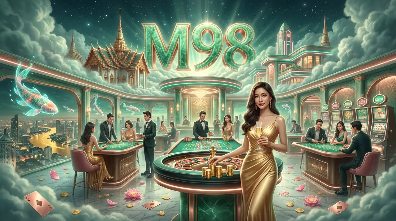 Visual identitas M98 — seorang wanita Thailand berkelas dalam gaun emas berdiri percaya diri di meja roulette jade, dikelilingi tamu berpakaian terbaik, ikan koi terbang di udara, dan spire kuil Thai yang menjulang di cakrawala malam — bukan sekadar estetika. Ia adalah janji pengalaman: di M98, setiap sesi bermain adalah momen eksklusif yang layak dikenang.